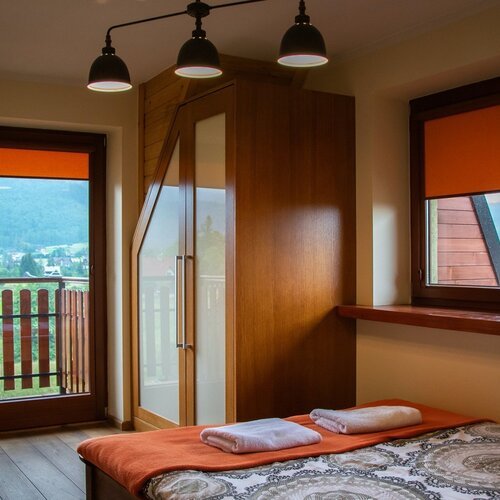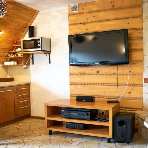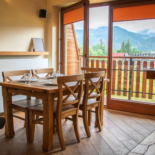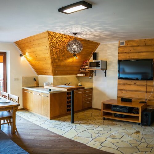 Apartament znajduje się w nowo wybudowanym obiekcie. Oprócz sypialni, składa się z pokoju dziennego z kompletnie wyposażonym aneksem kuchennym, sofą, TV, DVD. Z balkonów rozpościera się wspaniały widok. Drewniane meble, wygodne sofy, kamienna podłoga części apartamentu oraz kominek nadają wnętrzu wyjątkowy klimat. Całości dopełnia luksusowa łazienka z kabiną prysznicową. Goście mają do dyspozycji darmowe miejsce parkingowe.