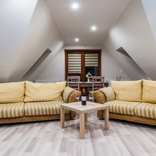 Przestronny salon wyposażony jest w wygodny zestaw wypoczynkowy, kominek, TV, DVD. Apartament zawiera nowoczesny i kompletnie wyposażony aneks kuchenny oraz łazienkę. Do głównej sypialni przylega sauna. Apartament zawiera 2 balkony. Jest zaaranżoany w nowoczesnym stylu z drewnianymi dodatkami. Goście mają do dyspozycji darmowe miejsce parkingowe.