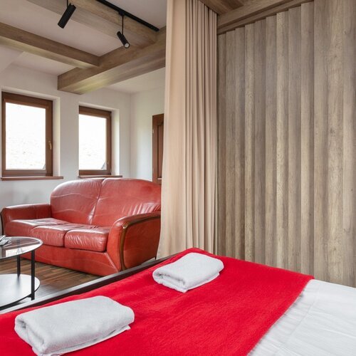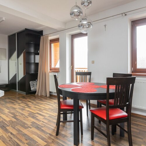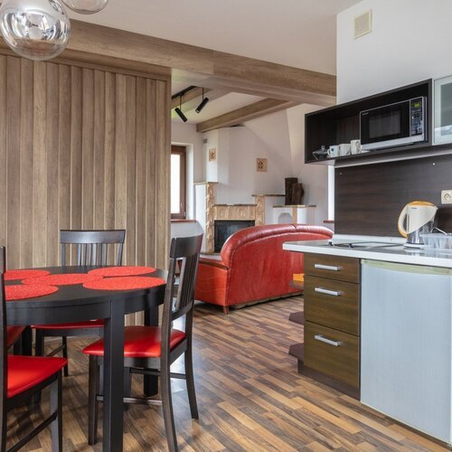 Apartament znajduje się w nowo wybudowanym obiekcie. Składa się z pokoju dziennego z kompletnie wyposażonym aneksem kuchennym, sofą, łożem małżeńskim, TV, DVD i kominkiem. W pokoju dziennym znajdują się łoże małżeńskie i sofa. Oddzielna sypialnia zawiera dwa pojedyncze łóżka. Balkon, łazienka z natryskiem.