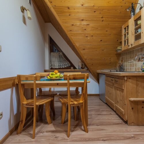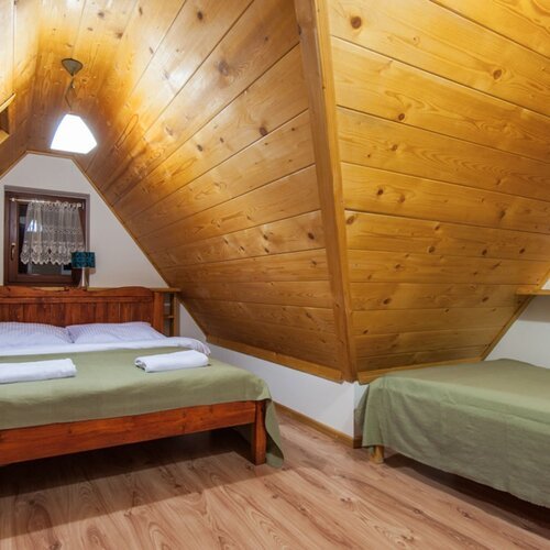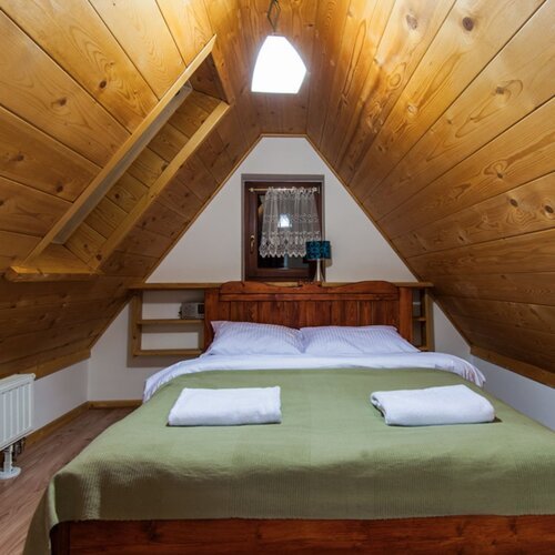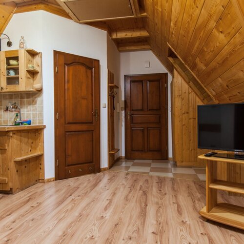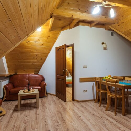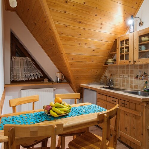 Apartament znajduje się w nowo wybudowanym obiekcie na poddaszu. Drewniane skosy nadają mu przytulny charakter. Znajduje się tu sypialnia z łożem małżeńskim oraz pojedynczym łóżkiem. Ponadto apartament składa się z pokoju dziennego z kompletnie wyposażonym aneksem kuchennym. Drewniany aneks kuchenny wraz z drewnianym stołem nadają wnętrzu domowy, rustykalny charakter. W pokoju dziennym znajdą Państwo także rozkładaną sofę, dzięki której można dokwaterować 1 osobę, oraz TV. Znajduje się tu również wyjście na balkon. Poprzez swoją funkcjonalność apartament idealnie nadaje się do wypoczynku nie tylko dla 3- lub 4-osobowej rodziny, ale także sprzyja wypoczynkowi w gronie przyjaciół.