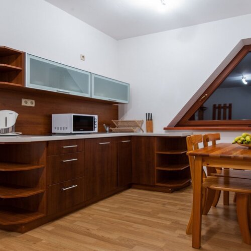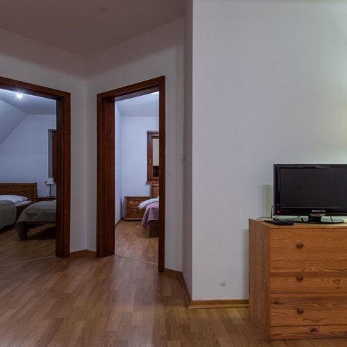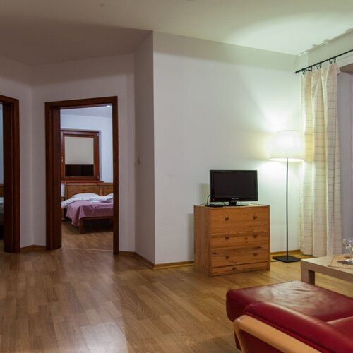 Apartament znajduje się w nowo wybudowanym obiekcie. Oprócz dwóch sypialni składa się z pokoju dziennego z kompletnie wyposażonym aneksem kuchennym, sofą, TV, DVD, dostępem do bezprzewodowego Internetu. Apartament posiada balkon oraz łazienkę z natryskiem. Goście do dyspozycji mają darmowe miejsce parkingowe.