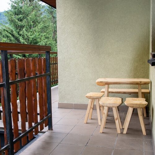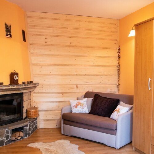 Znajduje się tu , pomieszczenie dzienne , połączone w pełni wyposażonym aneksem kuchennym, w którym również jest rozkładana sofa , co umożliwia nocleg dla dodatkowej osoby. Następnie pokój z kominkiem, połączony z częścią sypialnianą, znajduję się tu łóżko małżeńskie, z tej części jest również wyjście na balkon. Poprzez funkcjonalne rozmieszczenie, apartament idealnie nadaje się do wypoczynku dla nawet 3os.