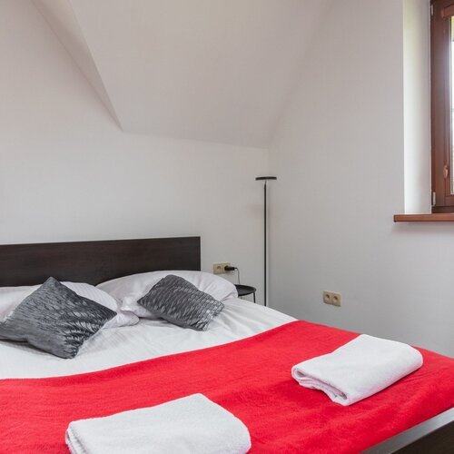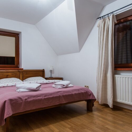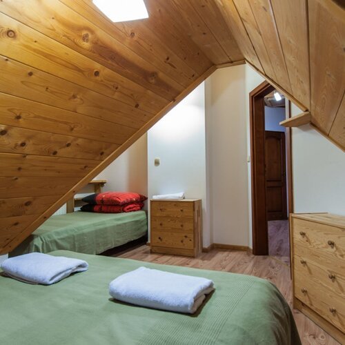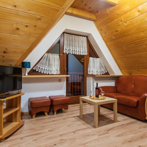 3-osobowy apartament o powierzchni 35 m², umiejscowiony jest na przytulnym poddaszu wykończonym w drewnie. Apartament posiada kompletnie wyposażony aneks kuchenny, balkon, łazienkę z natryskiem.